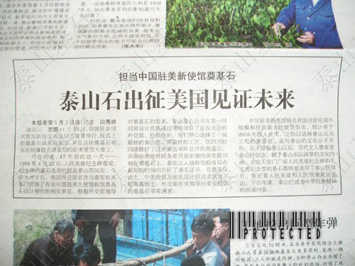 2005年4月22日,中國駐美國大使館新館舍奠基儀式隆重舉行,儀式上的奠基石就來自泰安,并且這塊奠基石將永遠(yuǎn)被鑲嵌在建成后的駐美使館大樓上。巧合的是,47年前的這一天--1958年4月22日,人民英雄紀(jì)念碑落成,紀(jì)念碑的基石選用的就是泰山花崗巖。今年3月2日,我國外交部首次與泰安有關(guān)部門對接了有關(guān)中國駐美大使館新館舍奠基石設(shè)計(jì)制作的相關(guān)事宜,根據(jù)外交部領(lǐng)導(dǎo)對奠基石的要求,泰山基石公司在第一時(shí)間將設(shè)計(jì)思路通過網(wǎng)絡(luò)傳給了遠(yuǎn)在北京的外交部,經(jīng)批準(zhǔn)后,公司精心選擇了一塊泰山青,用最好的工匠,用一個(gè)星期就做好了這塊重達(dá)600公斤的奠基石,并高標(biāo)準(zhǔn)地將國務(wù)委員唐家璇的親筆題詞刻在奠基石上。在奠基儀式上,中美政要及華裔著名建筑設(shè)計(jì)師貝聿明為工程奠基培土,外交部領(lǐng)導(dǎo)對公司提供的奠基石非常滿意。 中國駐美大使館將是我國目前在國外規(guī)模最大館舍,預(yù)計(jì)將于2008年投入使用。之所以選用泰山石為工程的奠基石,是與泰山的文化分不開的。孔子登臨泰山以后,歷代文人墨客登泰山抒壯志,賦予泰山石以深厚的文化內(nèi)涵。北京天安門廣場、人民英雄紀(jì)念碑、人民大會(huì)堂的基石都特意選用了泰山花崗巖,象征著穩(wěn)如泰山。千百年來,泰山已成為中華民族精神的組成內(nèi)容。